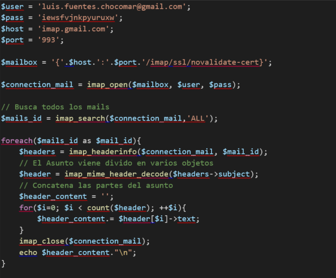 El siguiente código realiza la conexión a una cuenta de Gmail por medio del protocolo IMAP y a la vez obtiene los asuntos de todos los correos.
